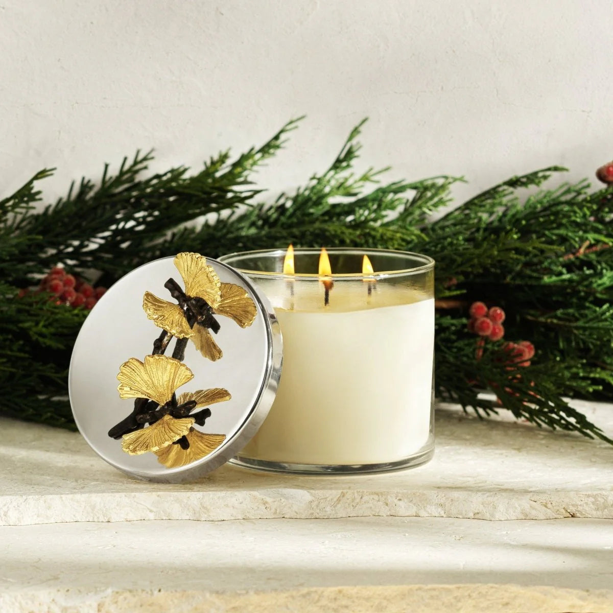 The Butterfly Ginkgo candle is inspired by a variety of ginkgo tree known as the "ginkgo biloba", where the leaves grow in such a manner that they are suggestive of butterflies. There is something very poetic about the idea of the ginkgo leaves metamorphosing into butterflies which land back on the branches that bore them.