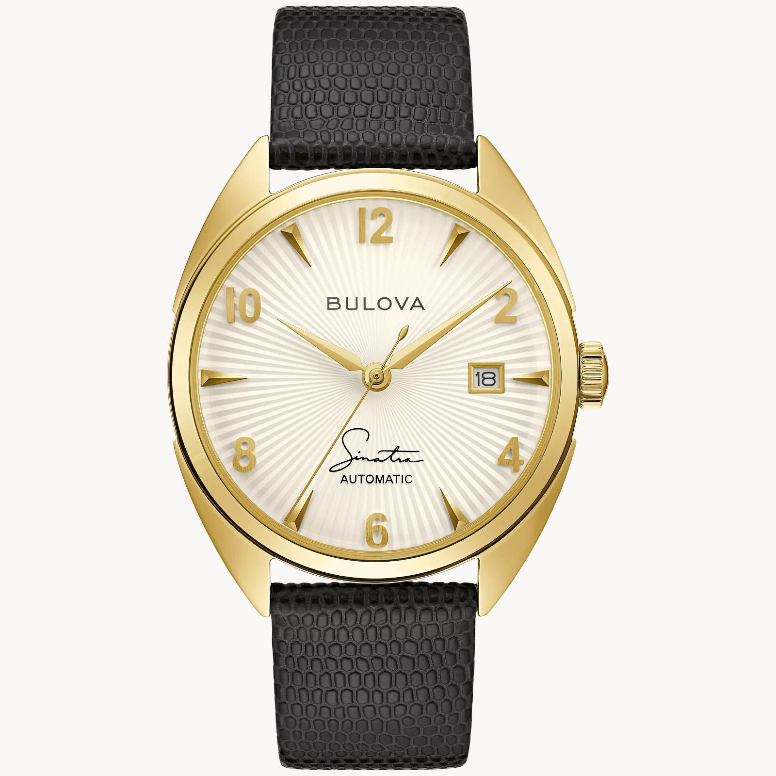 Incorporating vintage Bulova designs with the unmistakable elements of legendary performer, Frank Sinatra, the ‘Fly Me To The Moon’ watch features a gold-tone stainless steel case with gold-tone vintage style hands and markers. Frank Sinatra’s signature is displayed elegantly on the textured silver white dial. The watch features a Miyota Caliber 8215 21-jewel automatic movement with a 42-hour power reserve and calendar. The exhibition case back showcases the fine movement and features the song title as well as the iconic Fedora Hat, which can also be found etched on the crown. The black lizard grain textured leather strap features a deployant buckle and is stamped with the name ‘Fly Me To The Moon’ along the inside. The watch features a domed sapphire crystal with AR coating and water resistance to 30 meters